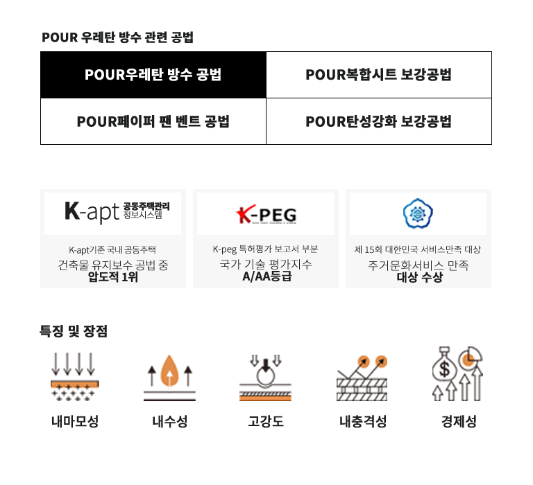 POUR우레탄 방수 공법은 액상형 도막재를 사용하여 이음매 없는 연속적인 방수층을 형성하는 도장공법입니다.