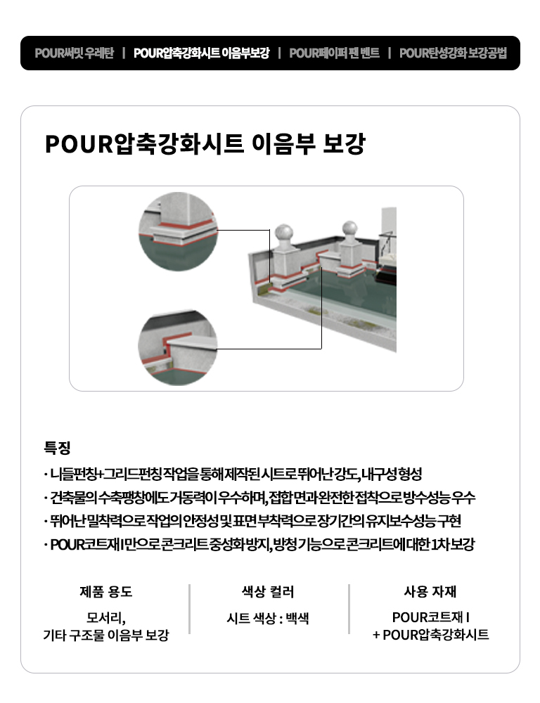 또한, 기타 구조물의 이음부와 모서리 부위에는 POUR복합시트 보강공법을 적용하여 더욱 견고한 방수층을 형성할 수 있습니다.
