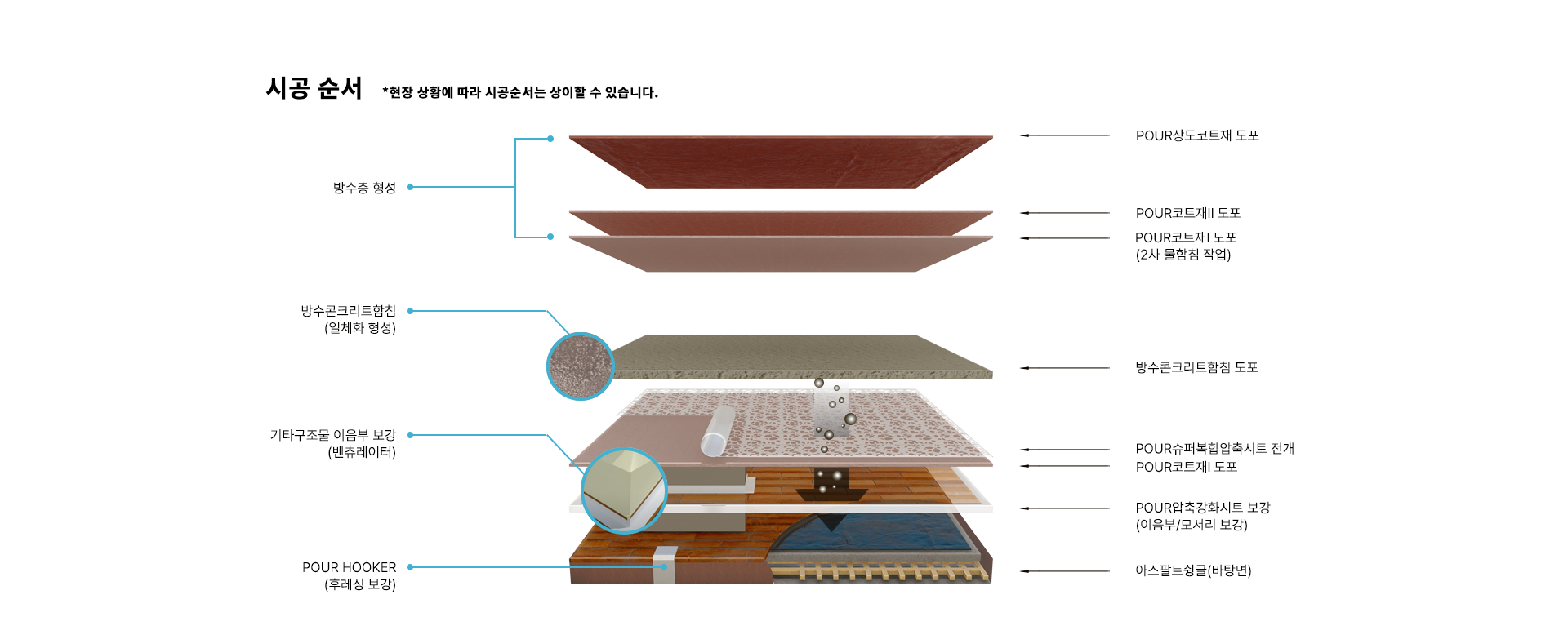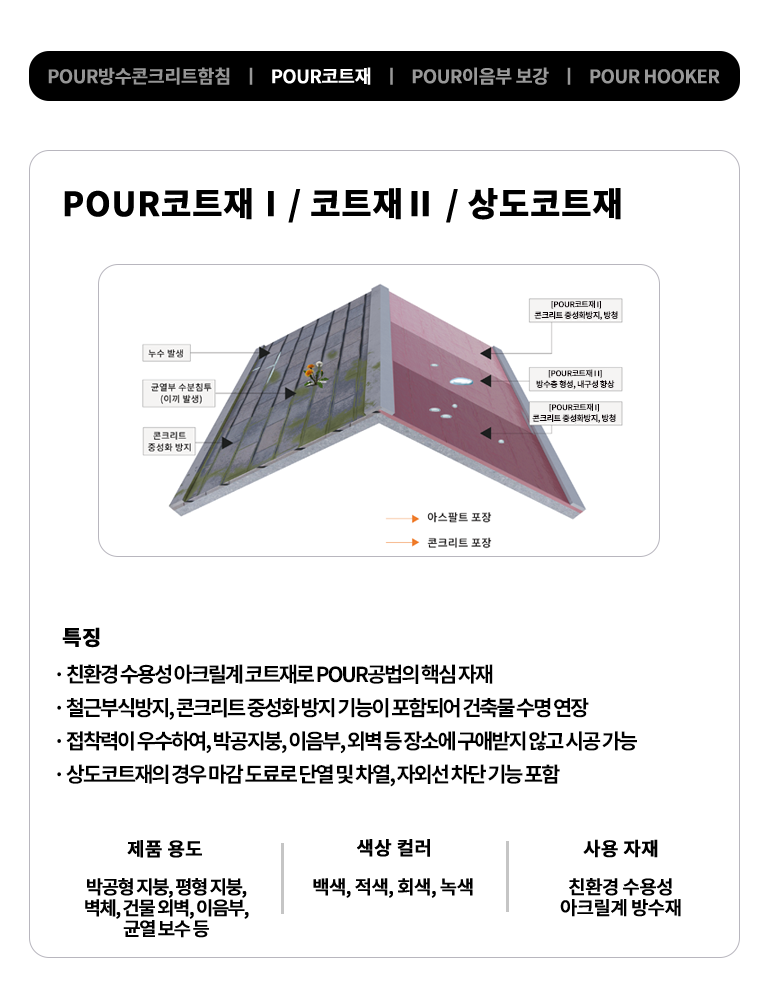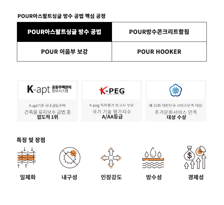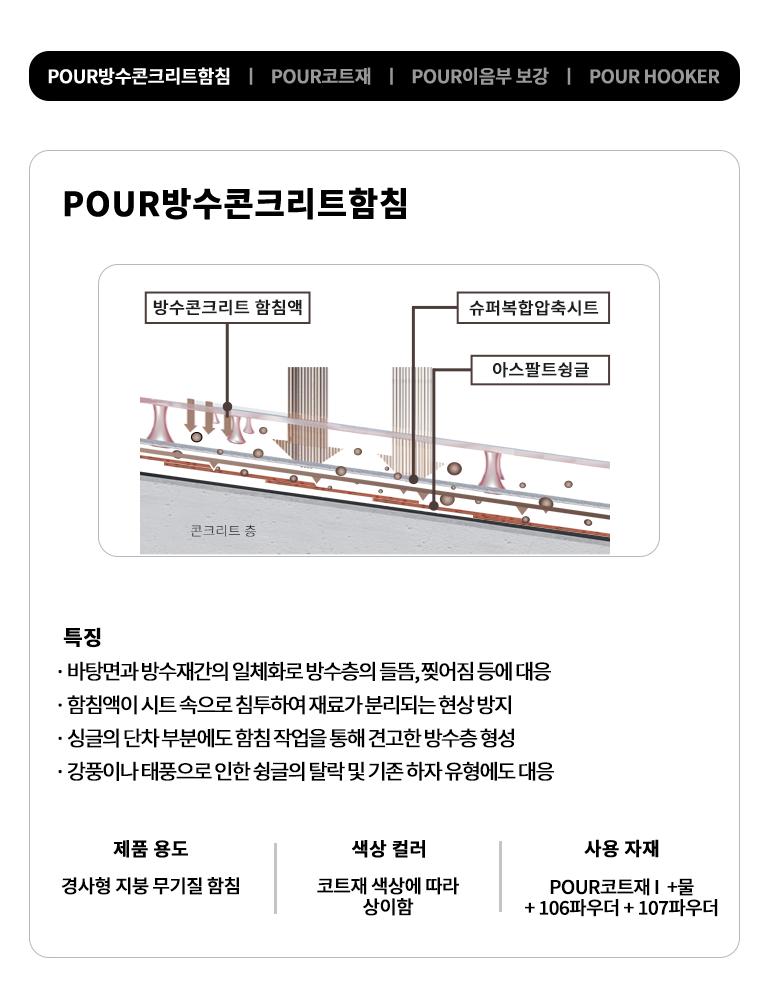 POUR아스팔트슁글 및 배수로 방수공법은 니들펀칭에 의해 조직화 된 섬유시트에 수용성 아크릴계 방수재를 함침/적층하여 복합방수층을 형성하는 공법입니다. 이 공법은 이중구조의 복합방수층으로 재료분리 형상을 방지하고, 슁글이나 후레싱이 강품이나 충격등 외부요인에 의해 탈락하는 것을 방지하며,