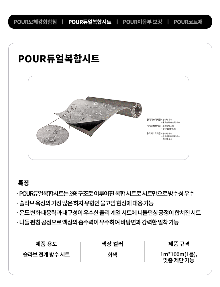 POUR슬라브 듀얼강화방수 공법은 모체 콘크리트 보강, 도막 방수, 시트 방수를 결합한 복합 방수 공법으로 기존 도막 방수의 내구성과 시트 방수의