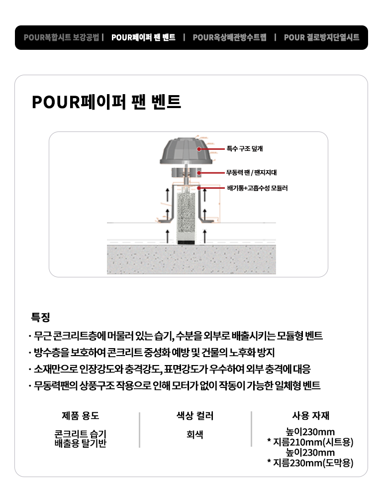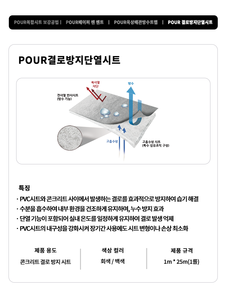 POUR PVC 방수 공법은 결로방지 단열시트를 사용하여 내부 결로를 효과적으로 차단하여 페이퍼 팬 벤트로 자연 배출이 가능하며,