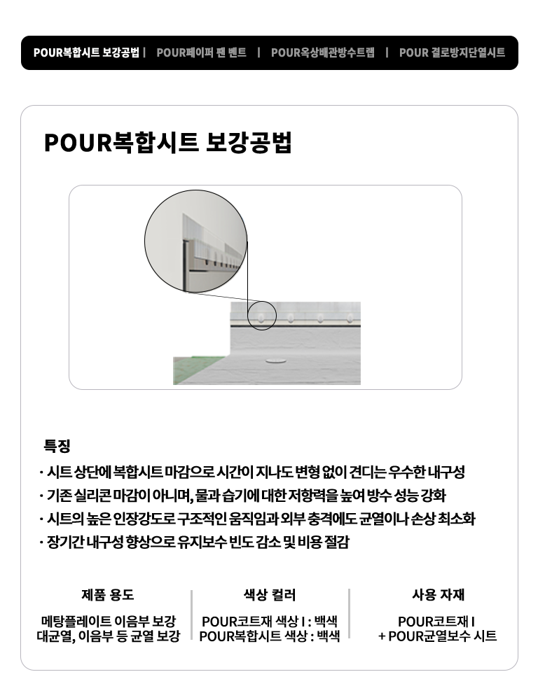 메탈플레이트 부분에 복합시트 보강공법을 적용하여 더욱 단단한 방수를 제공합니다.