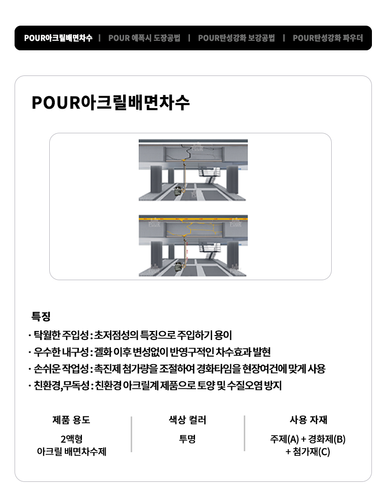 POUR아크릴 배면차수 공법은 2액형 아크릴계를 활용한 주입식 방수 공법으로 기존 1액형 주입식 방수 공법이 가지고 있는 시공적 한계를 극복하기 위해