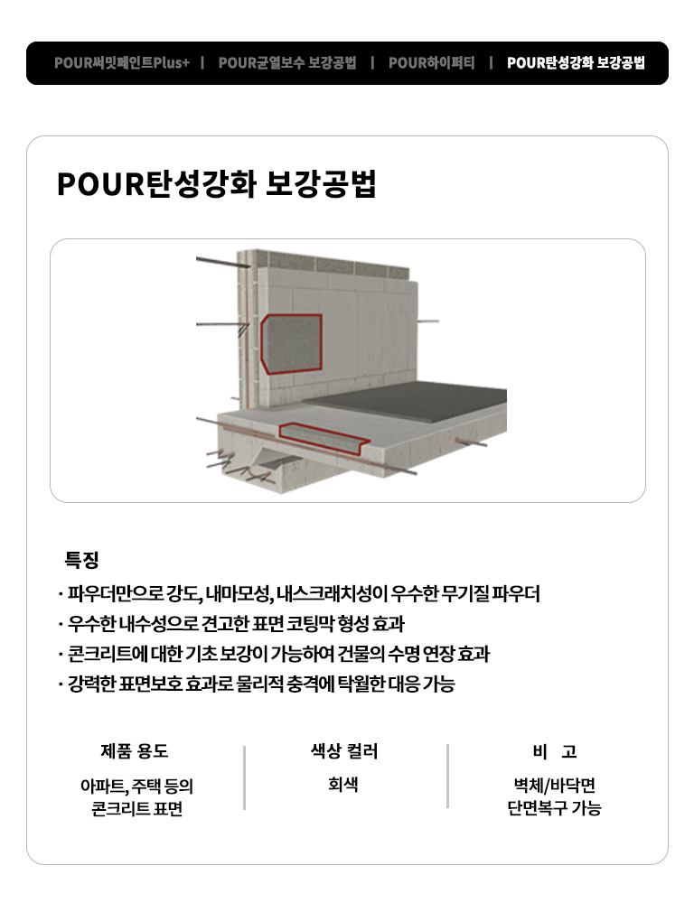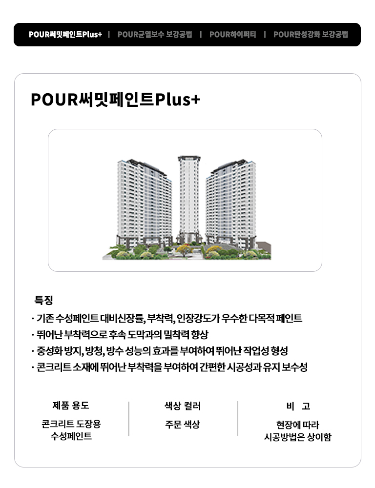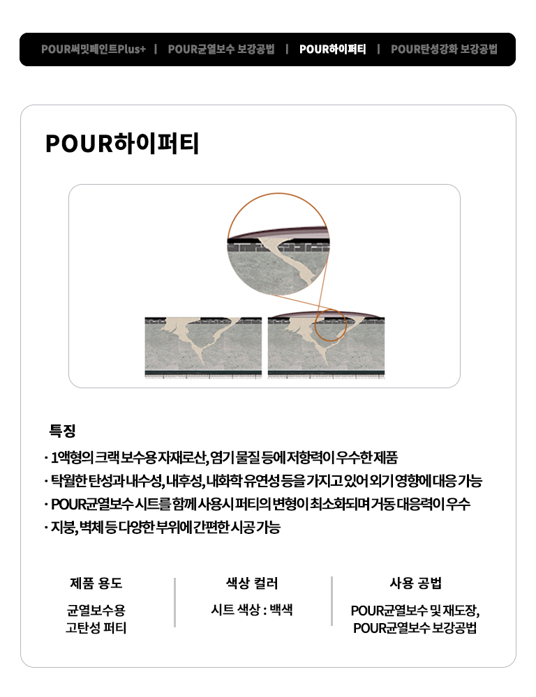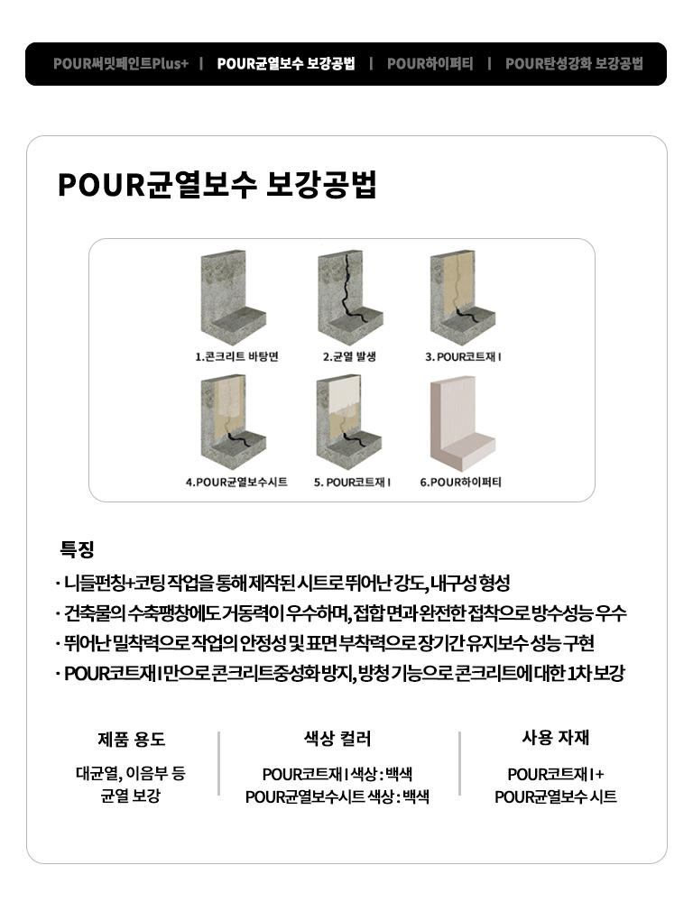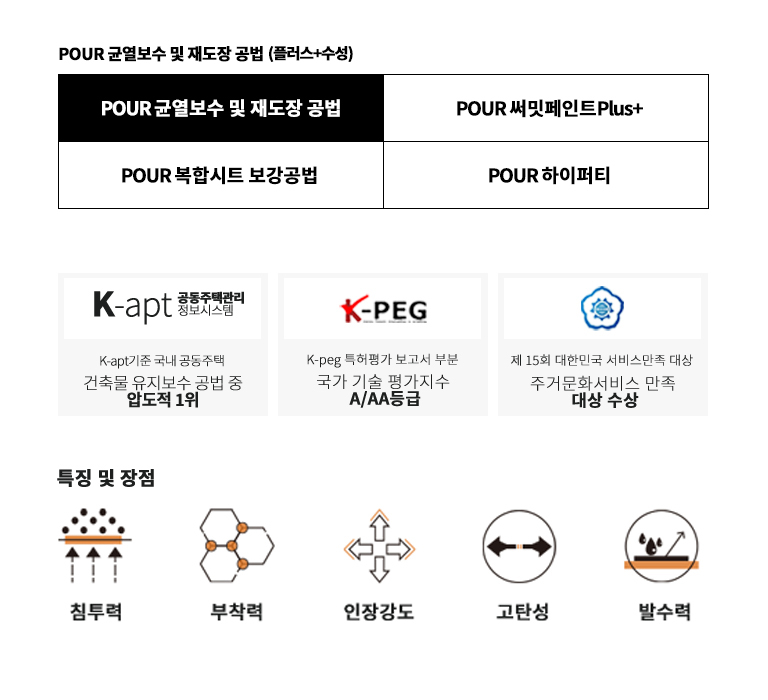 POUR균열보수 및 재도장 공법(플러스+수성)은 하이퍼티, 복합시트, 탄성강화 보강공법으로 구조적 안정성을 확보한 뒤,