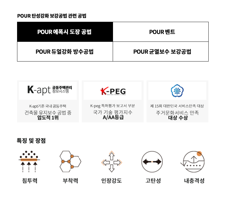 POUR탄성강화 보강공법은 콘크리트 구조물이 손상되어 박락된 부분의 표면을 견고하게 보강하여 강화하는 방식으로, 외벽의 단면 손상 부위를 효과적으로 복구하여