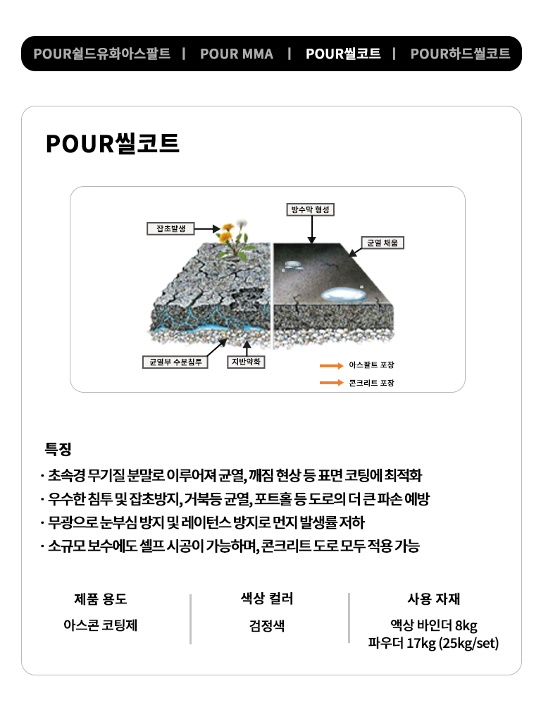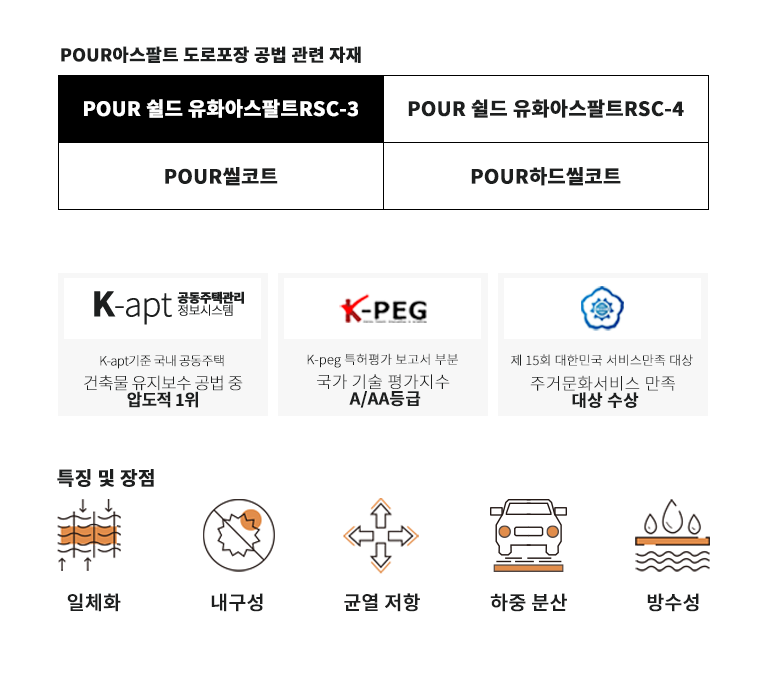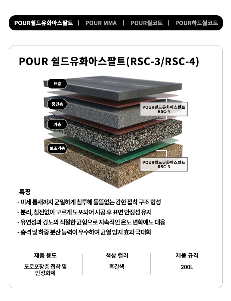 POUR아스팔트 도로포장 공법은 기존 도로의 유지보수나 신규 도로 건설에 활용하는 기술로 유화 아스팔트의 특성을 이용해 도료를