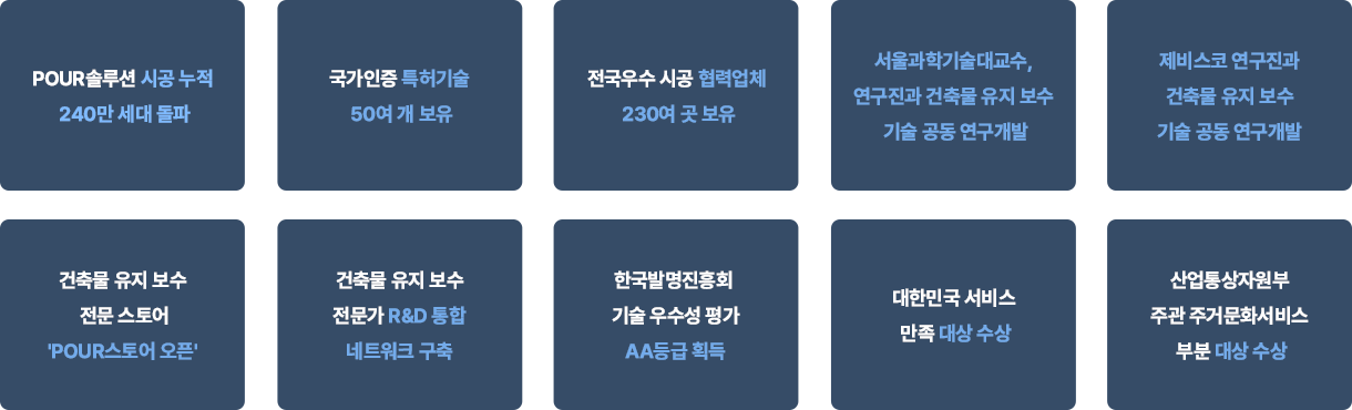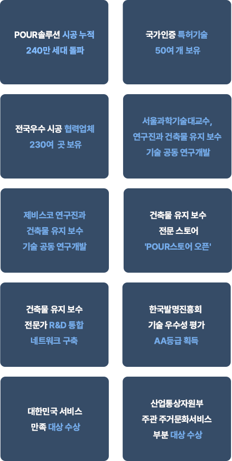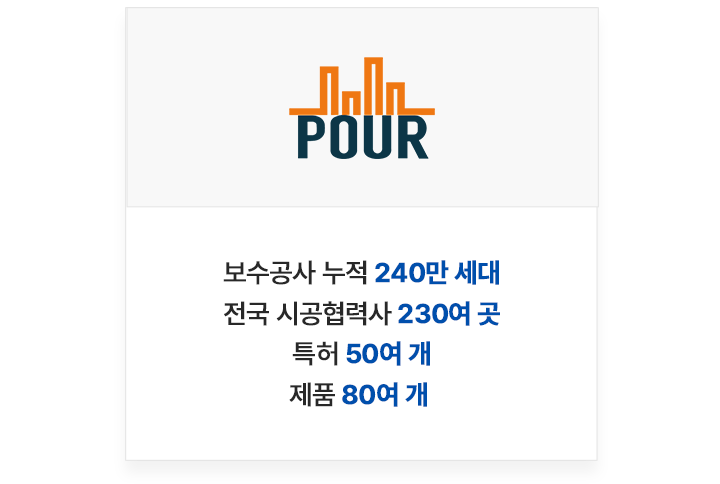 POUR솔루션은 전국 230여 곳의 우수한 시공 협력 업체와 협약을 맺고 있습니다.