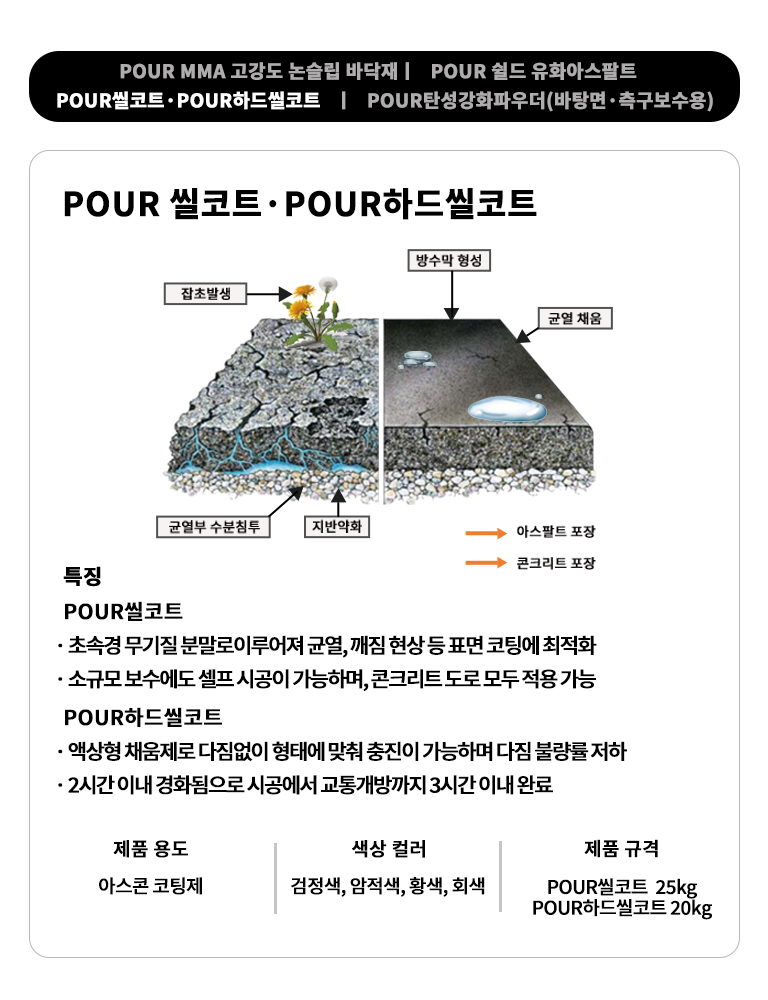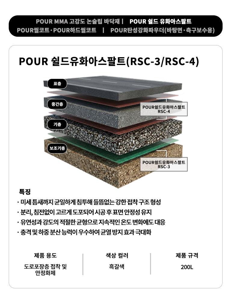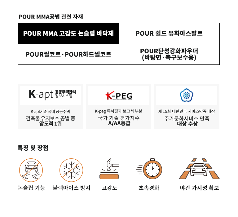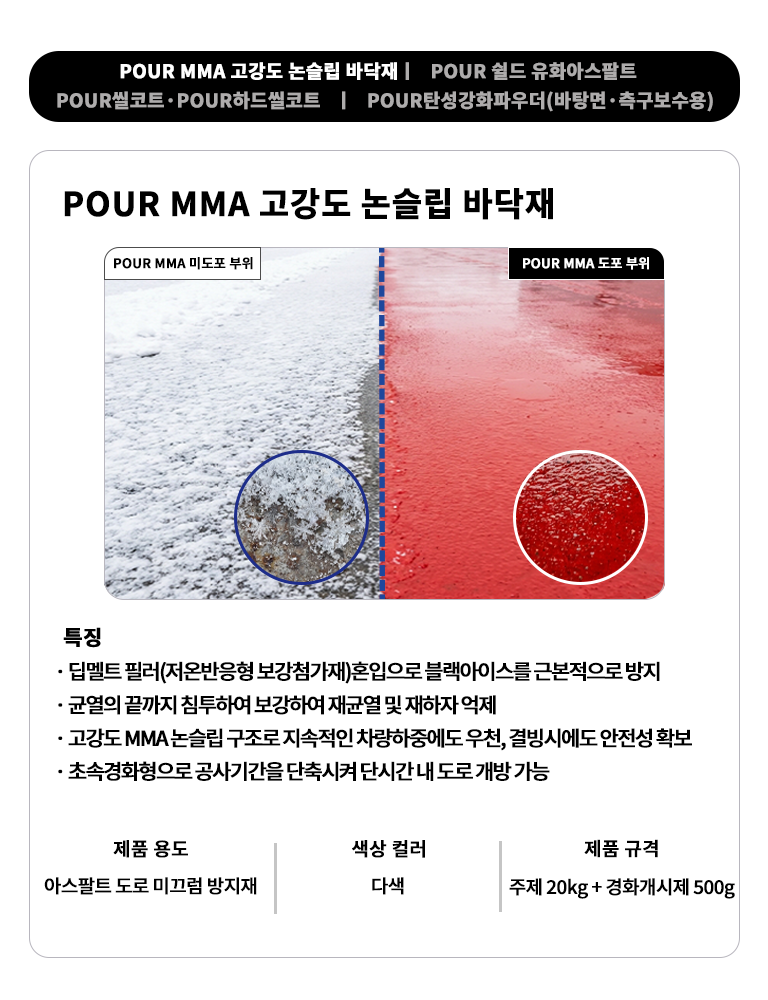 환경에서도 안정적인 경화와 시공 품질을 확보하며, 블랙아이스 및 미끄럼 사고를 효과적으로 예방합니다. 우수한 내구성과 안전성을