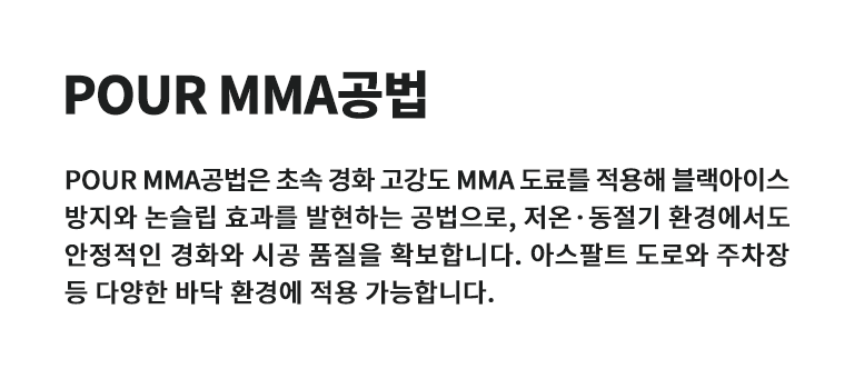 POUR MMA공법은 초속 경화 특성을 가진 고강도 MMA 도료를 적용한 블랙아이스 방지, 논슬립효과를 발현하는 공법입니다. 저온·동절기